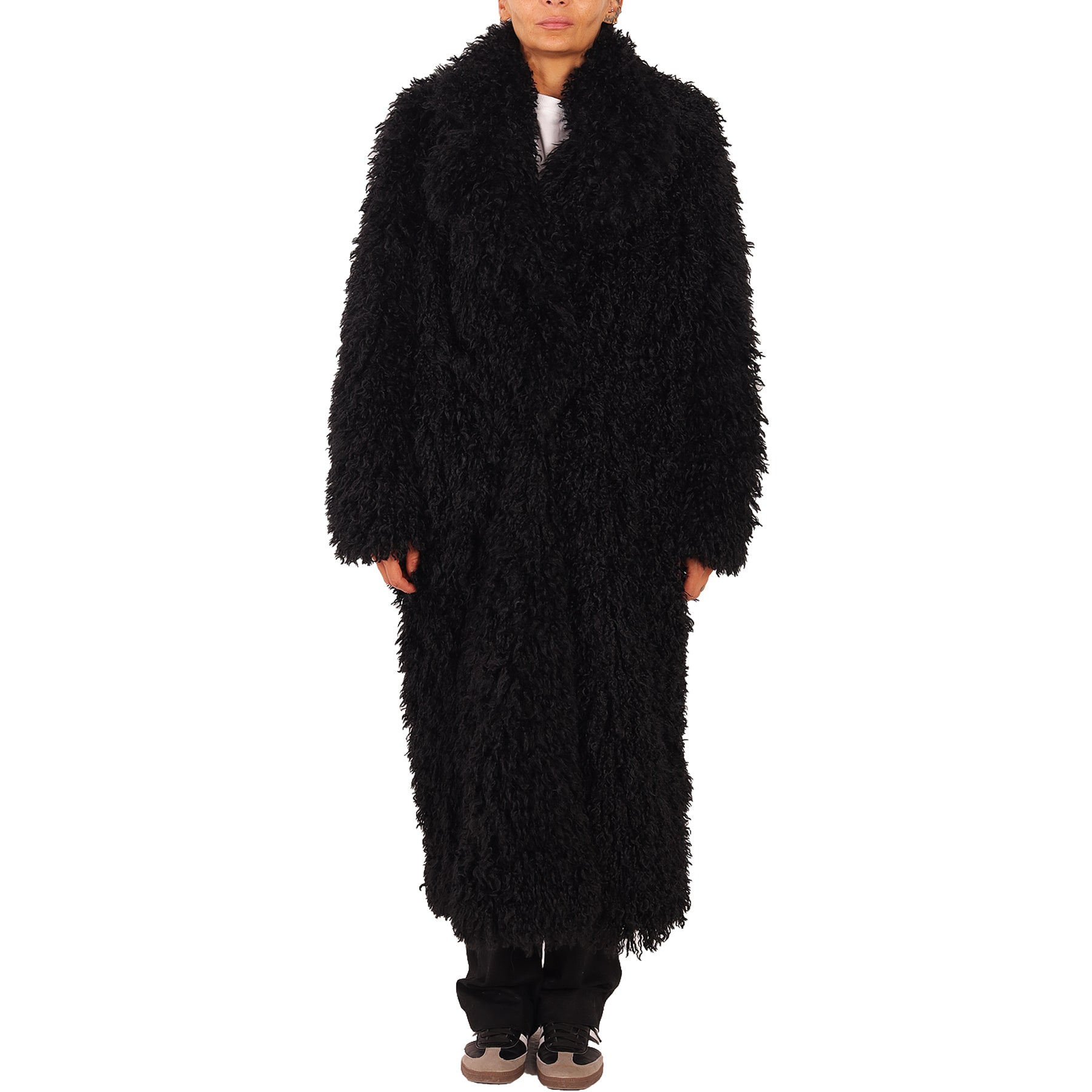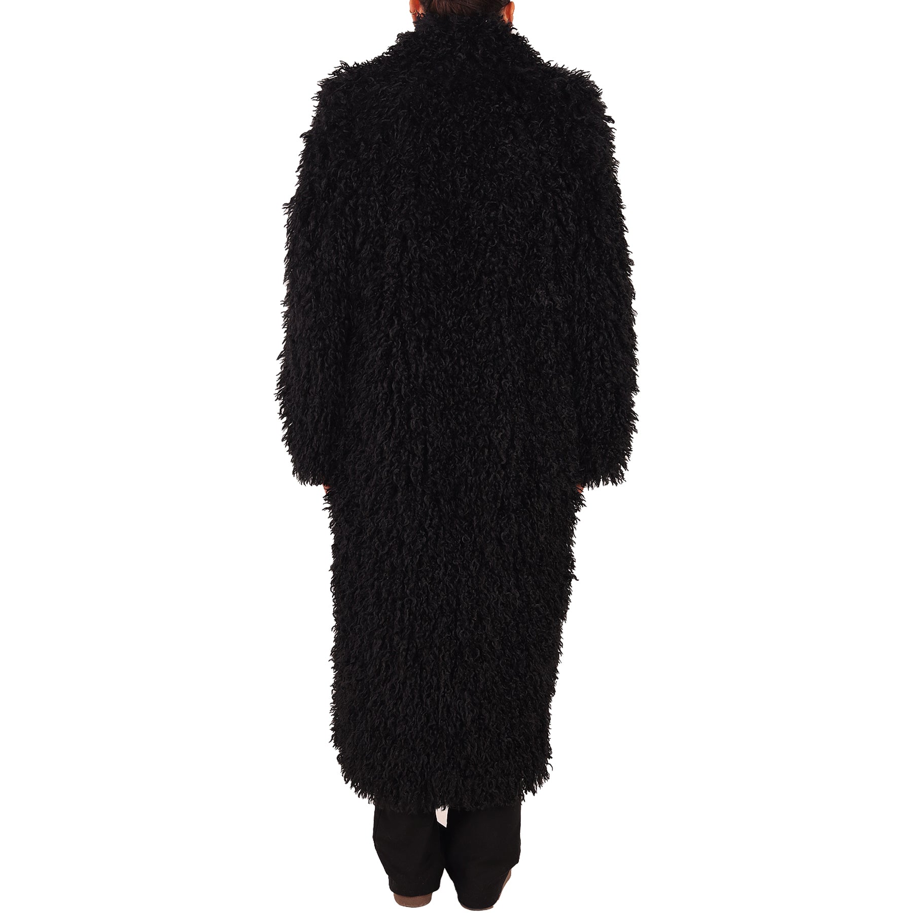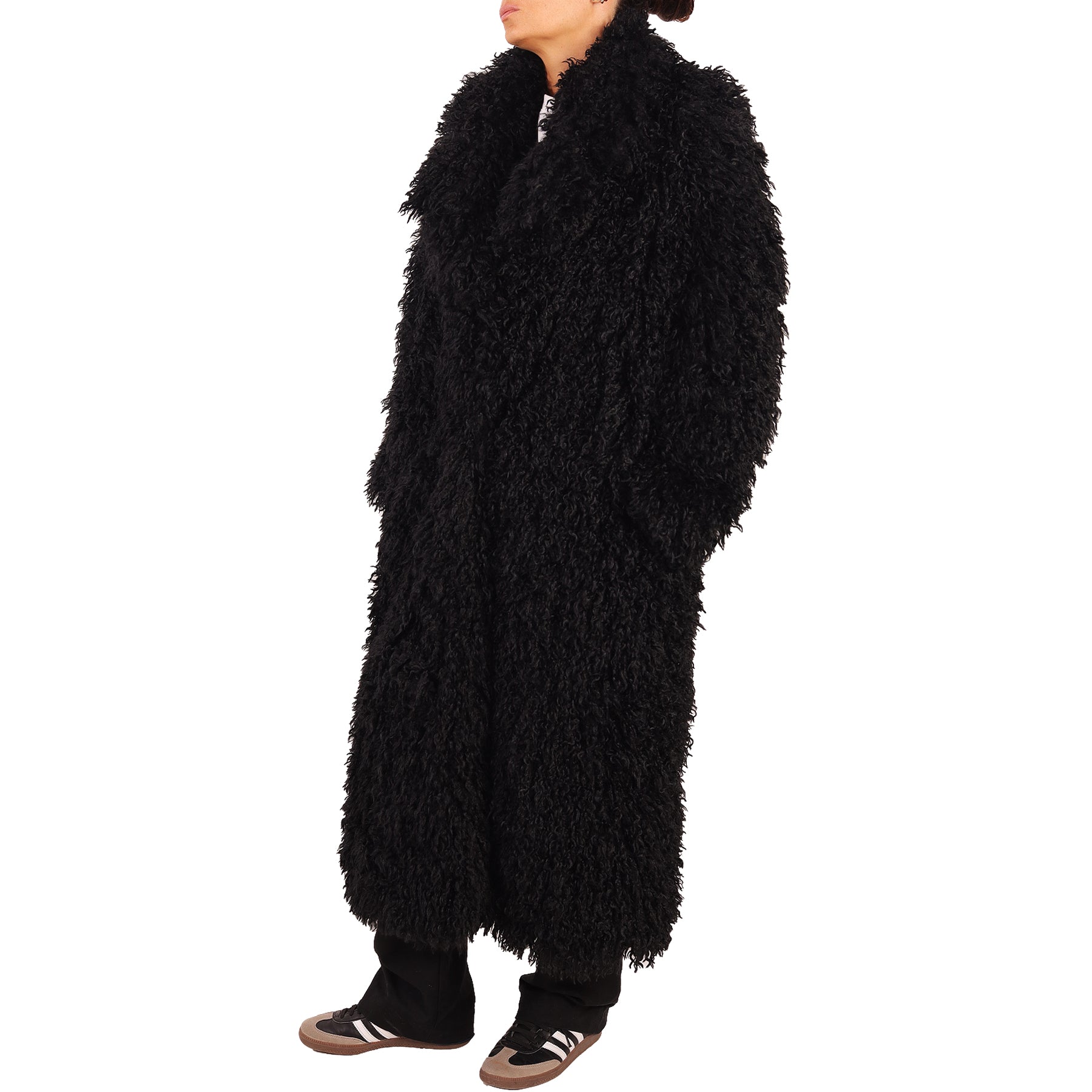 Ecopelliccia mongolia Momonì, nera, lunga, con chiusura con ganci, con tasche
