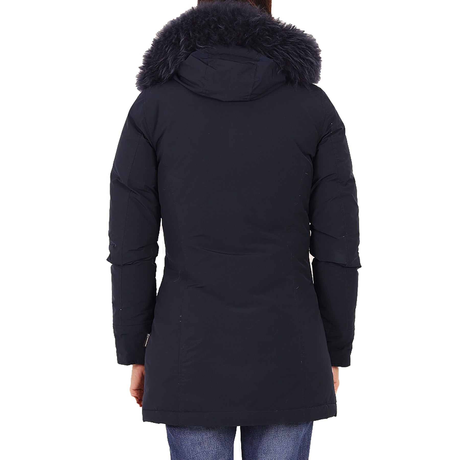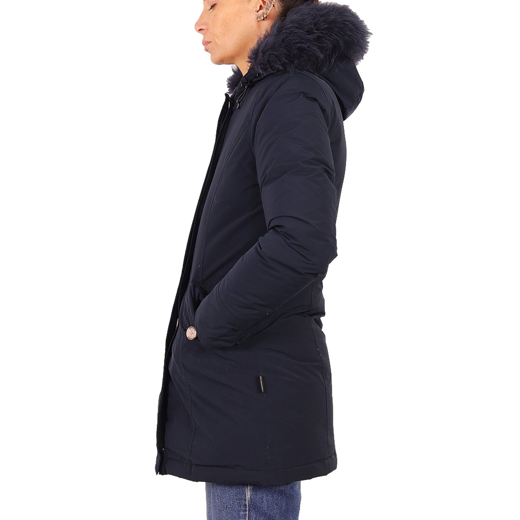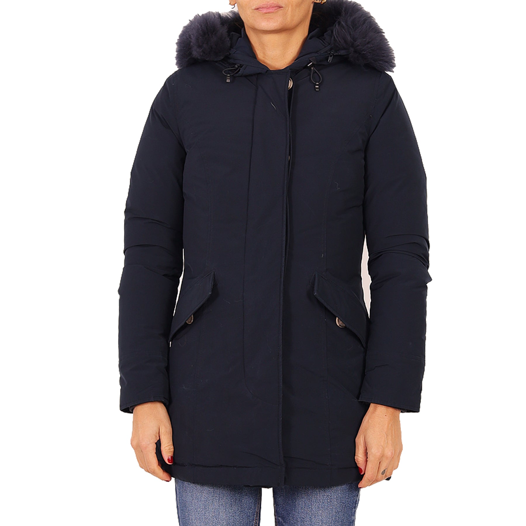 Piumino parka Woolrich, in tessuto impermeabile, colore blu, con tasche, chiusura con zip e bottoni nascosti, con cappuccio bordato in pelliccia blu rimovibile, con imbottitura in piuma, presenta micro imperfezioni