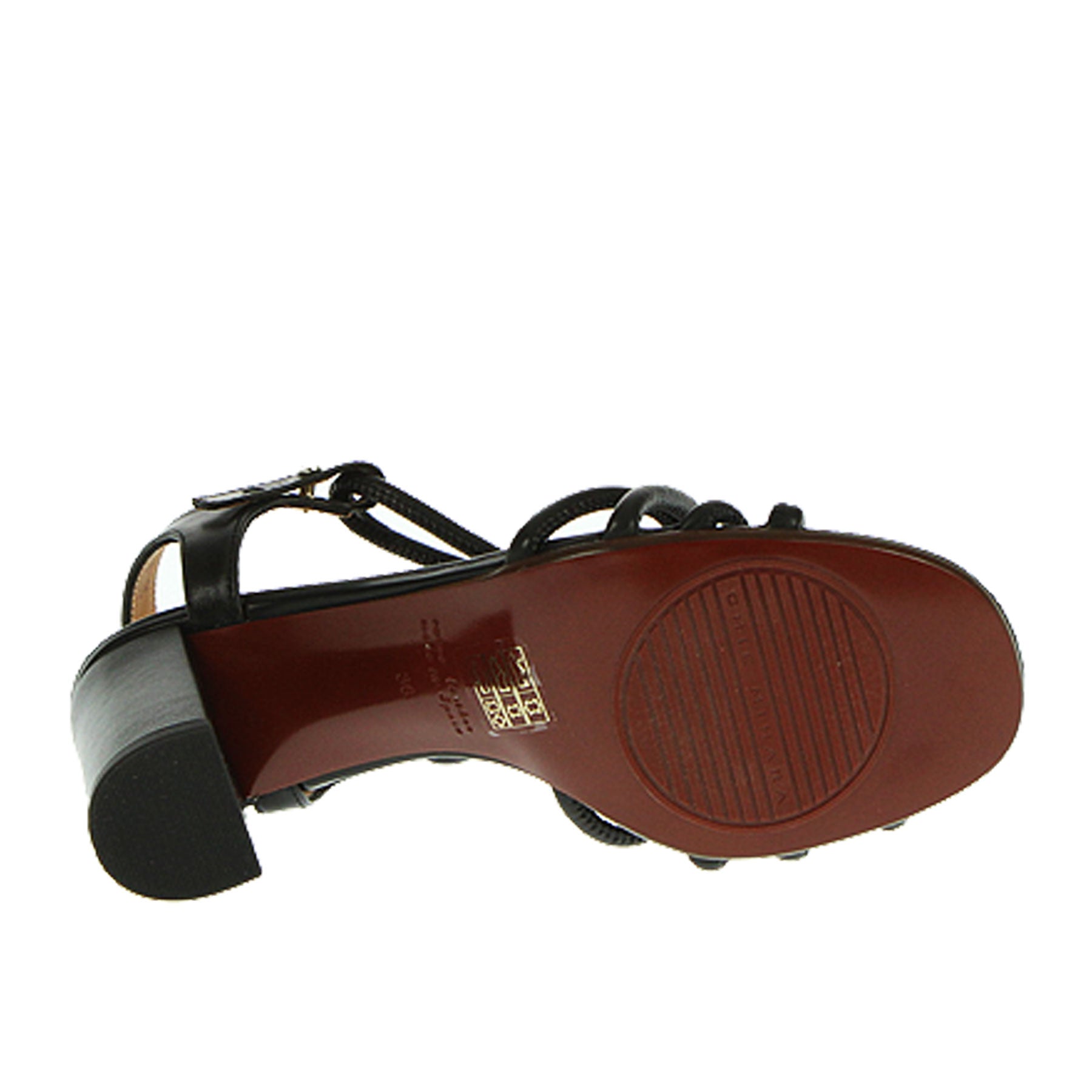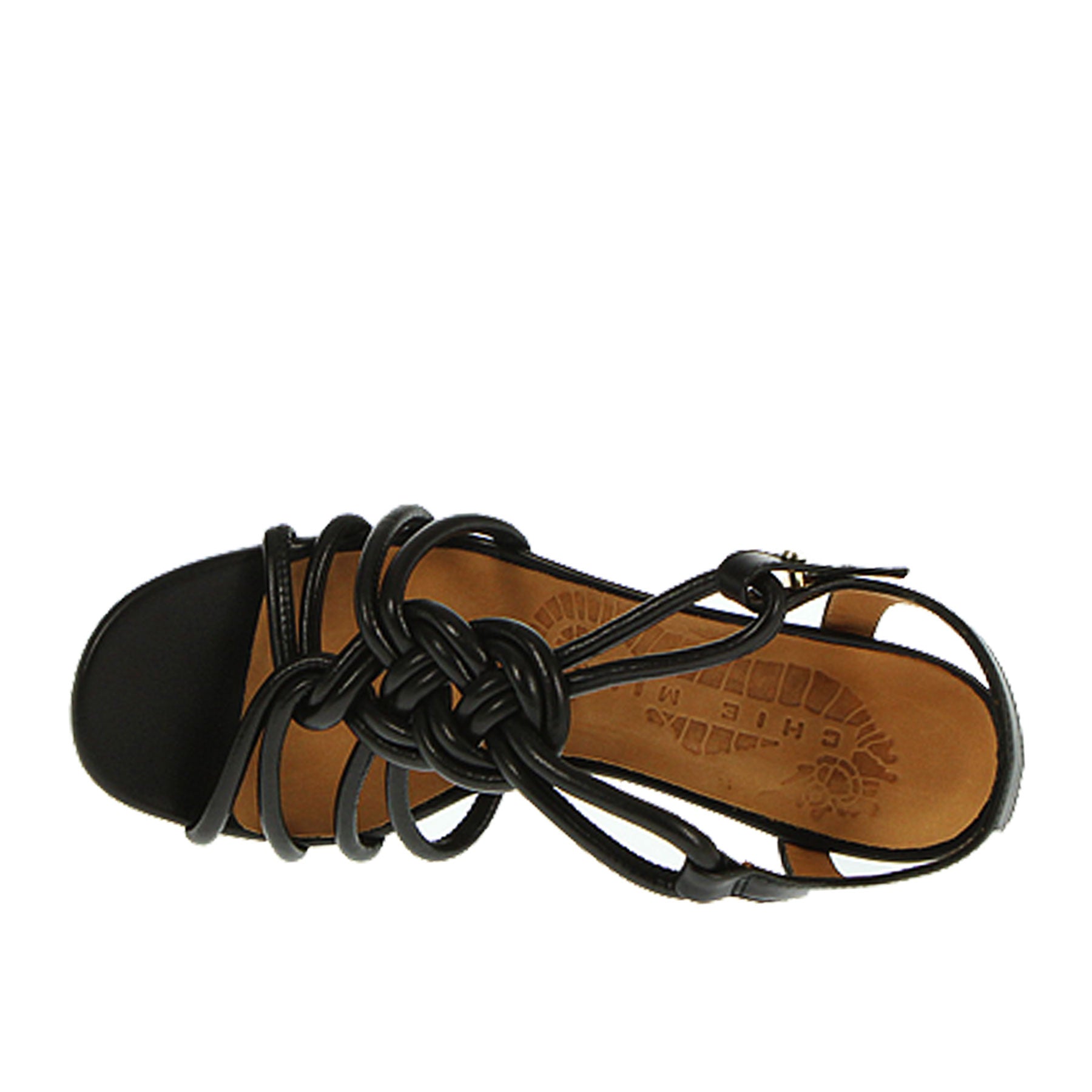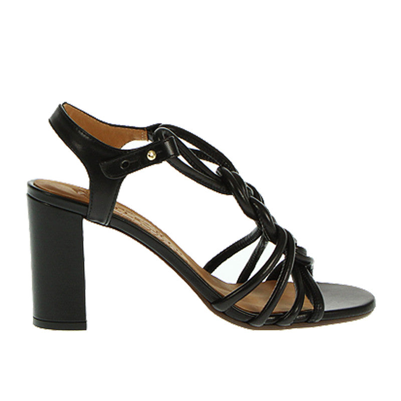 Sandali, Chie Mihara, in pelle nera, con intrecci sul davanti, tacco spesso 8 cm, chiusura laterale,  suola in cuoio e pelle.