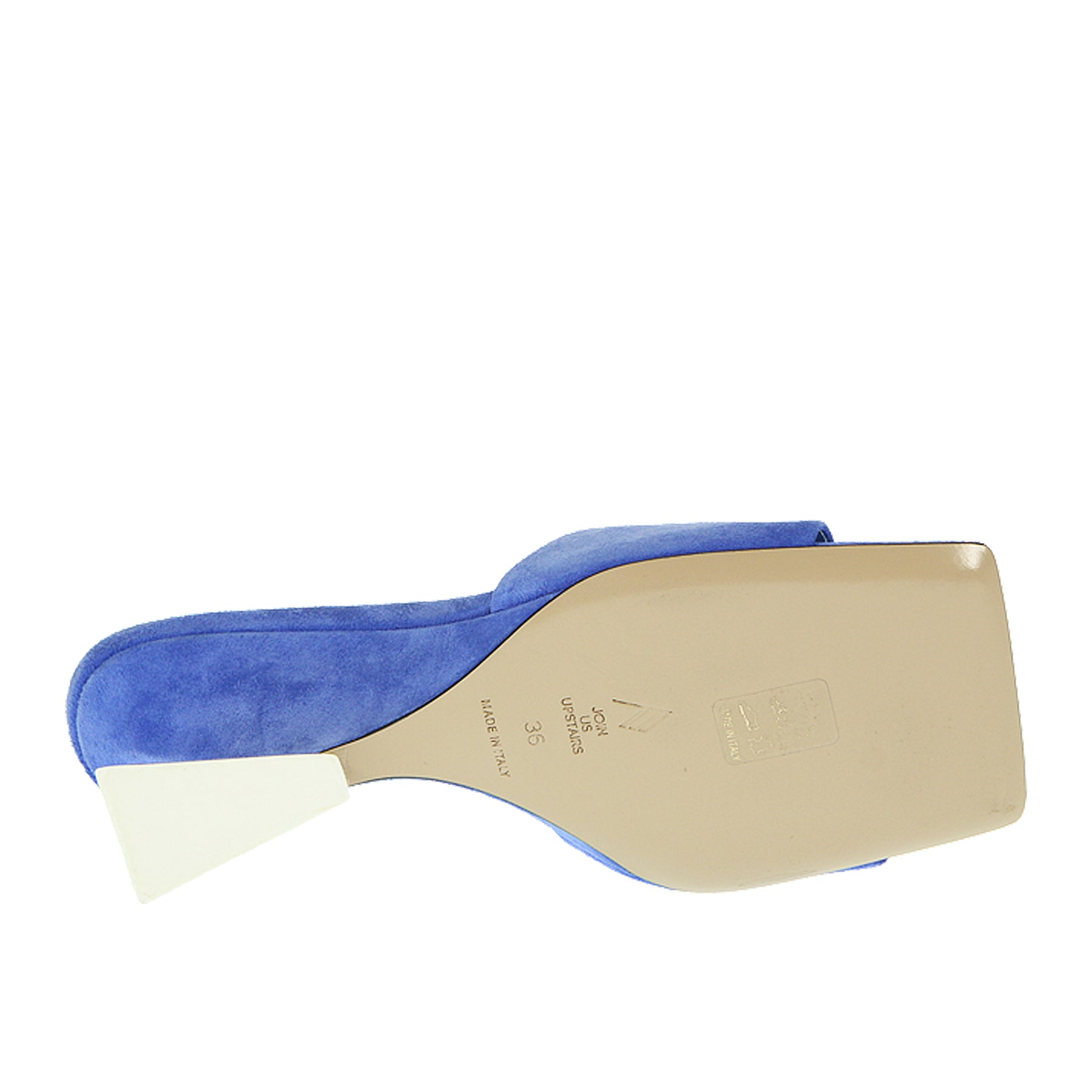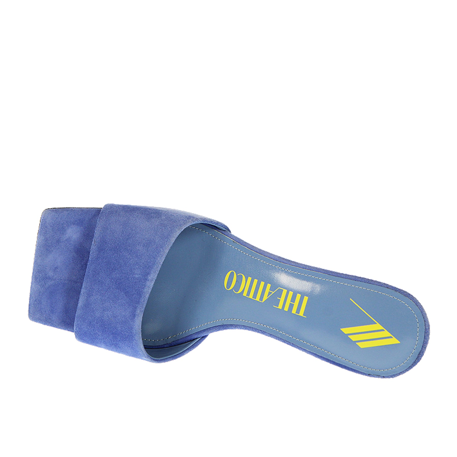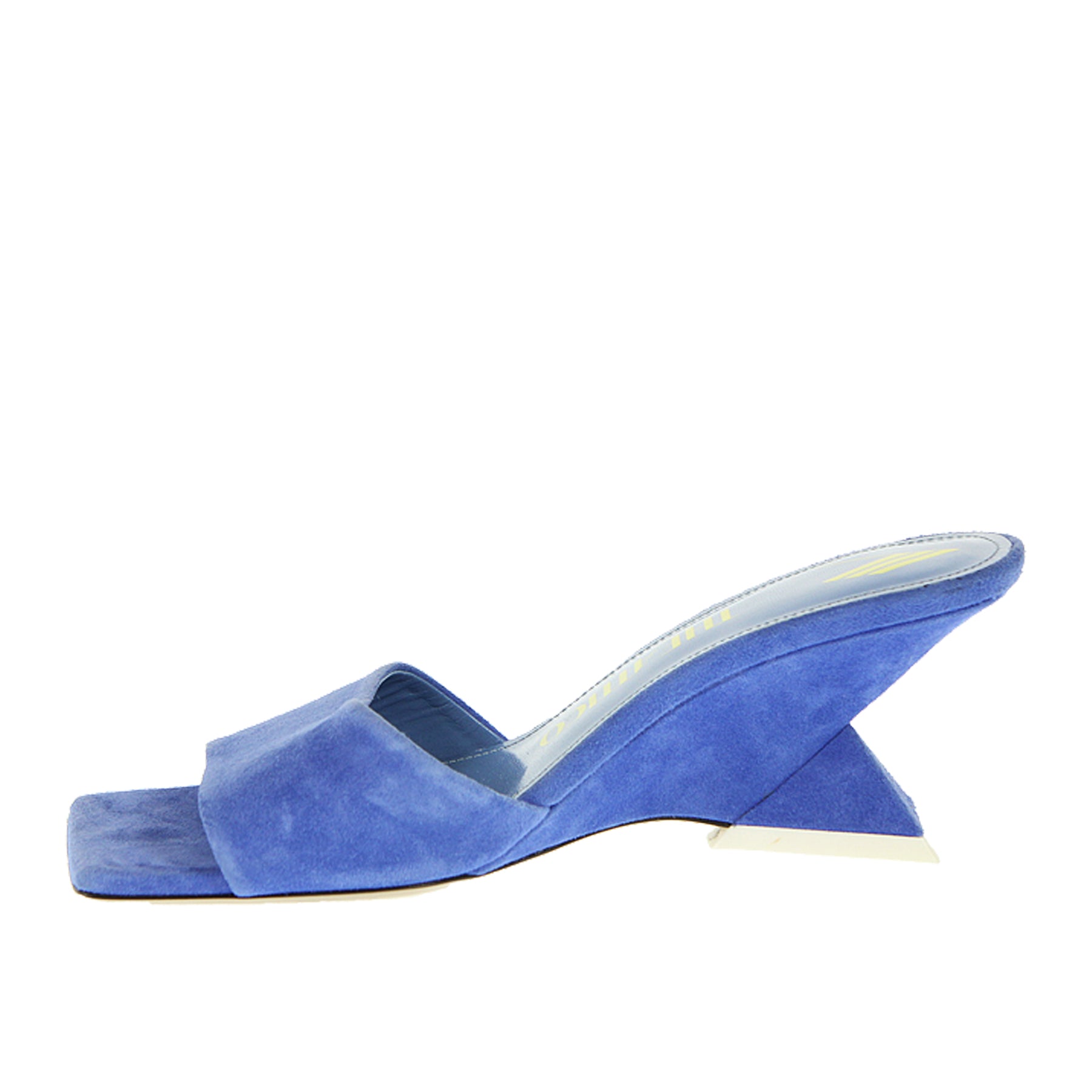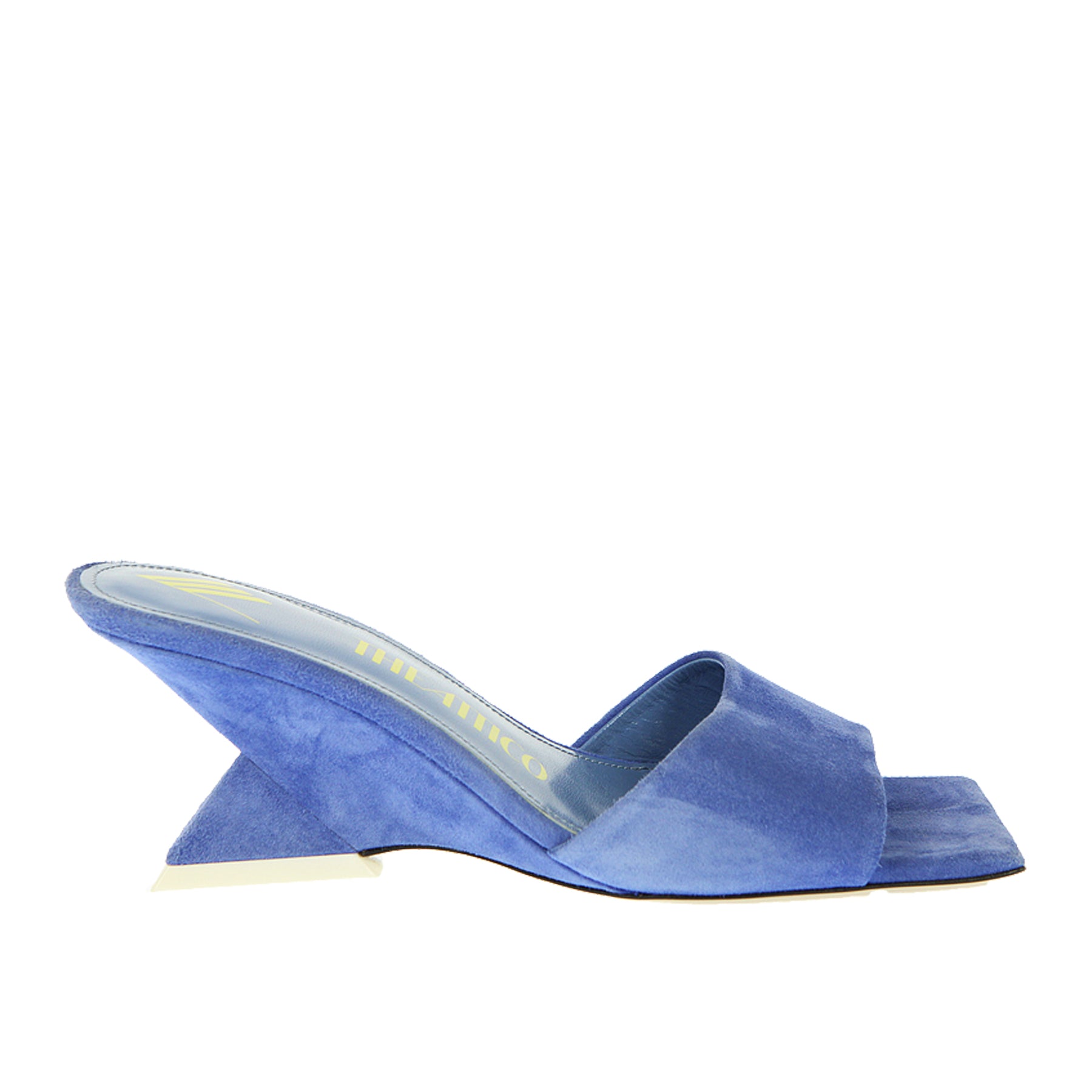 Sandalo The Attico, in camoscio, colore blu, aperte in punta, tacco sagomato a tringolo, altezza tacco 6 cm, suola in cuoio
