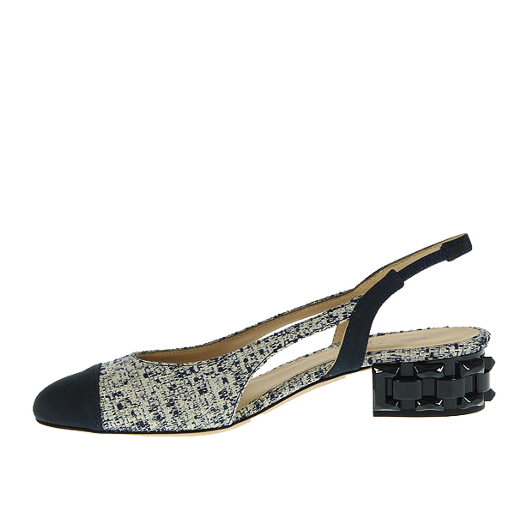 Chanel, Roberto Festa, in tessuto, punta tonda, blu e beige, con tacco 4 cm, suola in cuoio.
