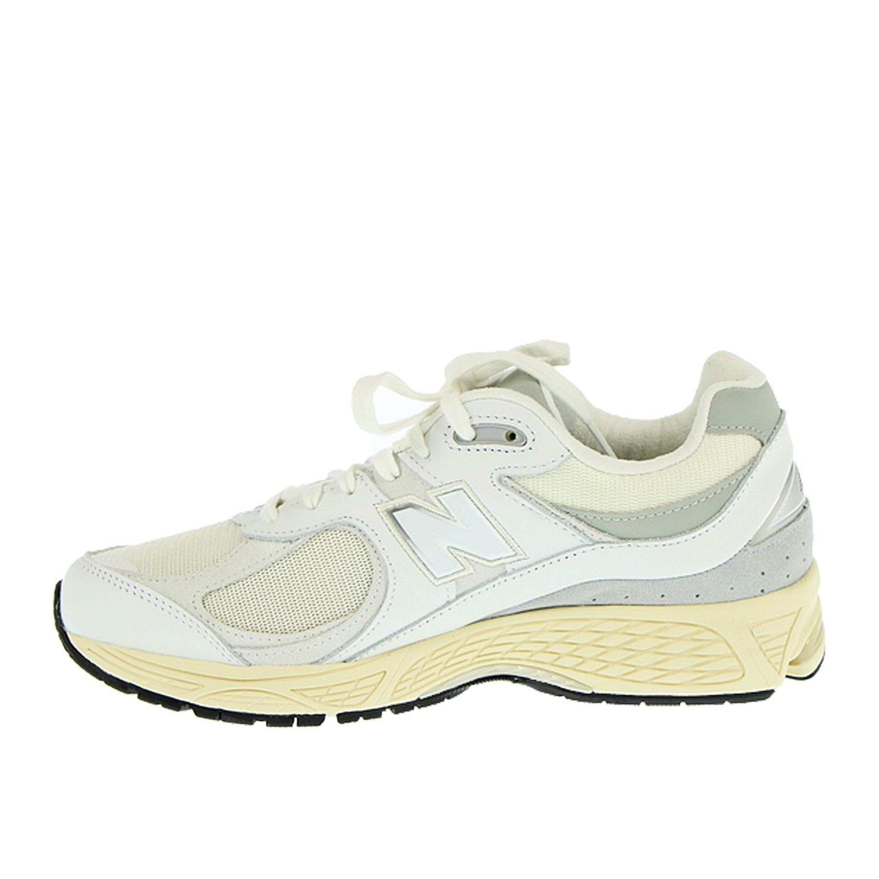 Sneakers, New Balance, modello M2002RIA, in pelle camoscio e tessuto, colore bianco, n laterlate argentata, con lacci, suola in gomma.
