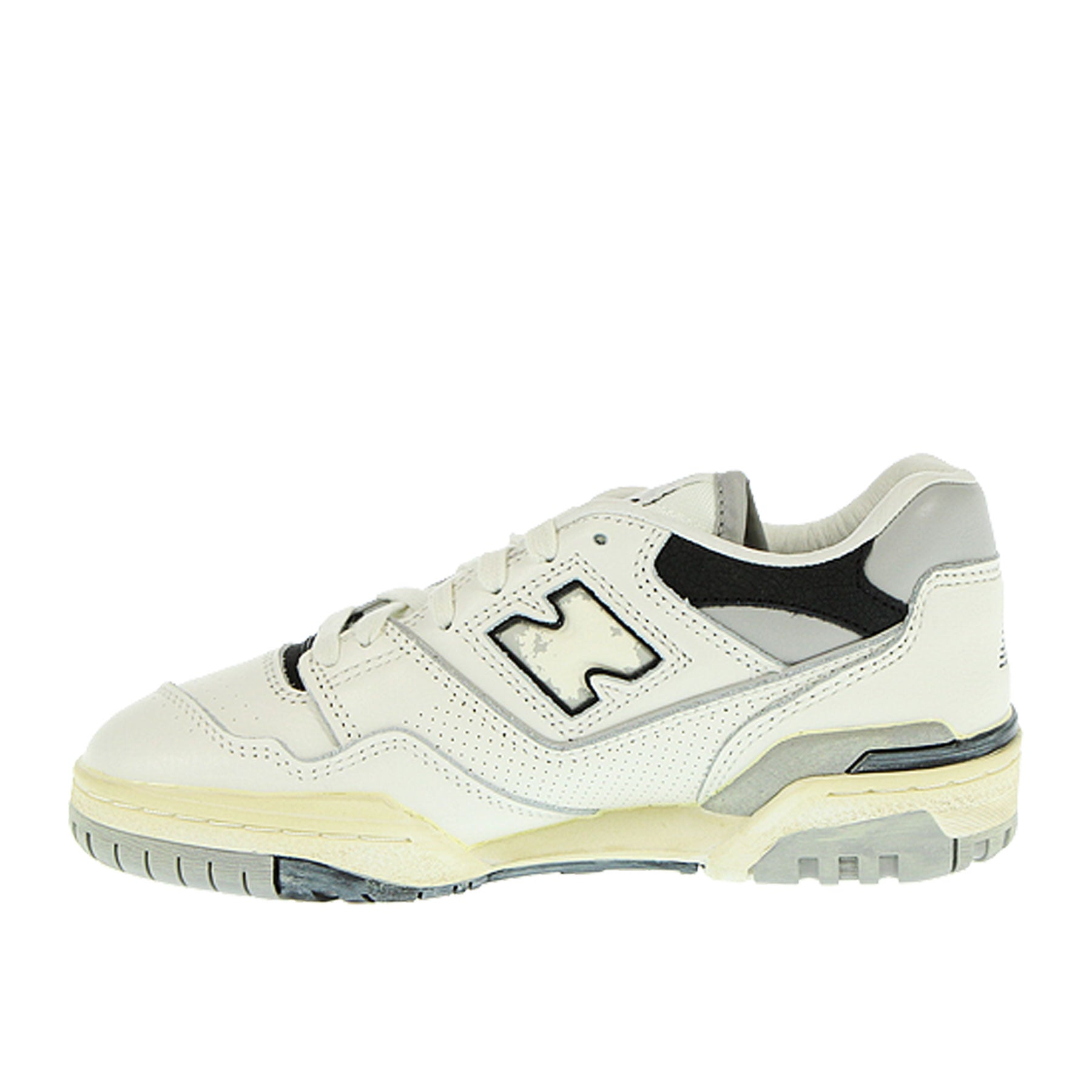 Sneakers New Balance, modello BB550VGB, colore bianco, baffo grigio, in pelle, punta tonda, chiusura con lacci, suola in gomma