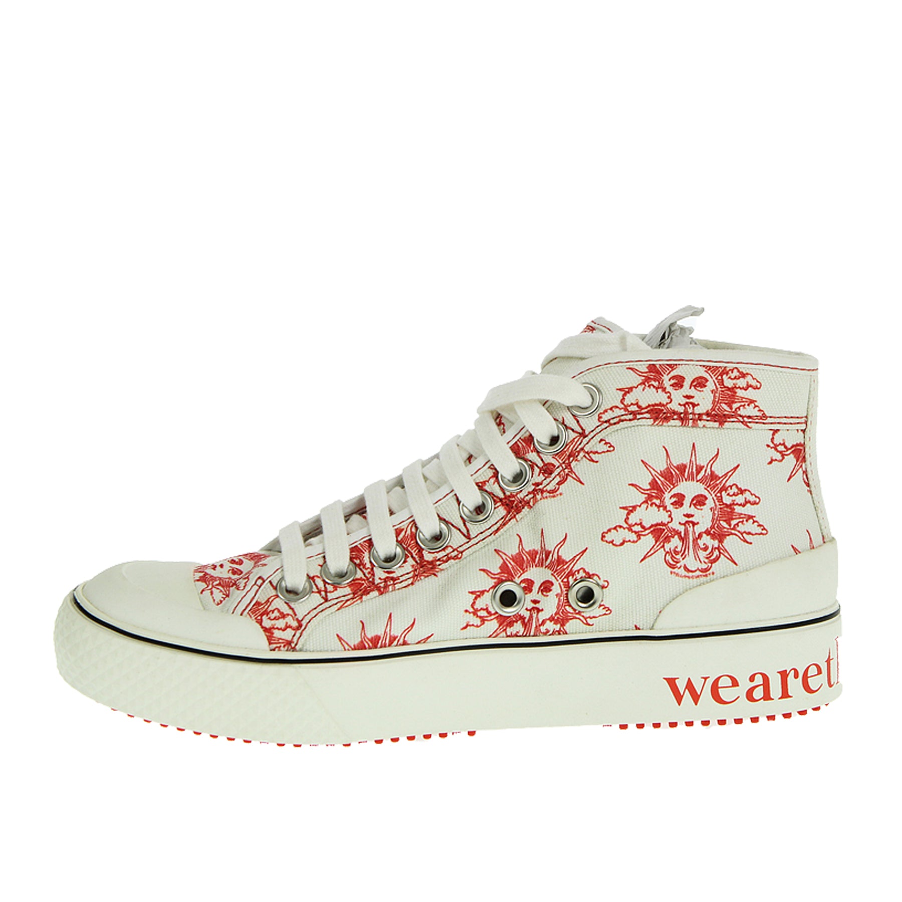 Sneakers Stella McCartney, a stivaletto, in tessuto, con punta rinforzata in gomma, colore bianco, con disegni rossi, con lacci, con suola in gomma.