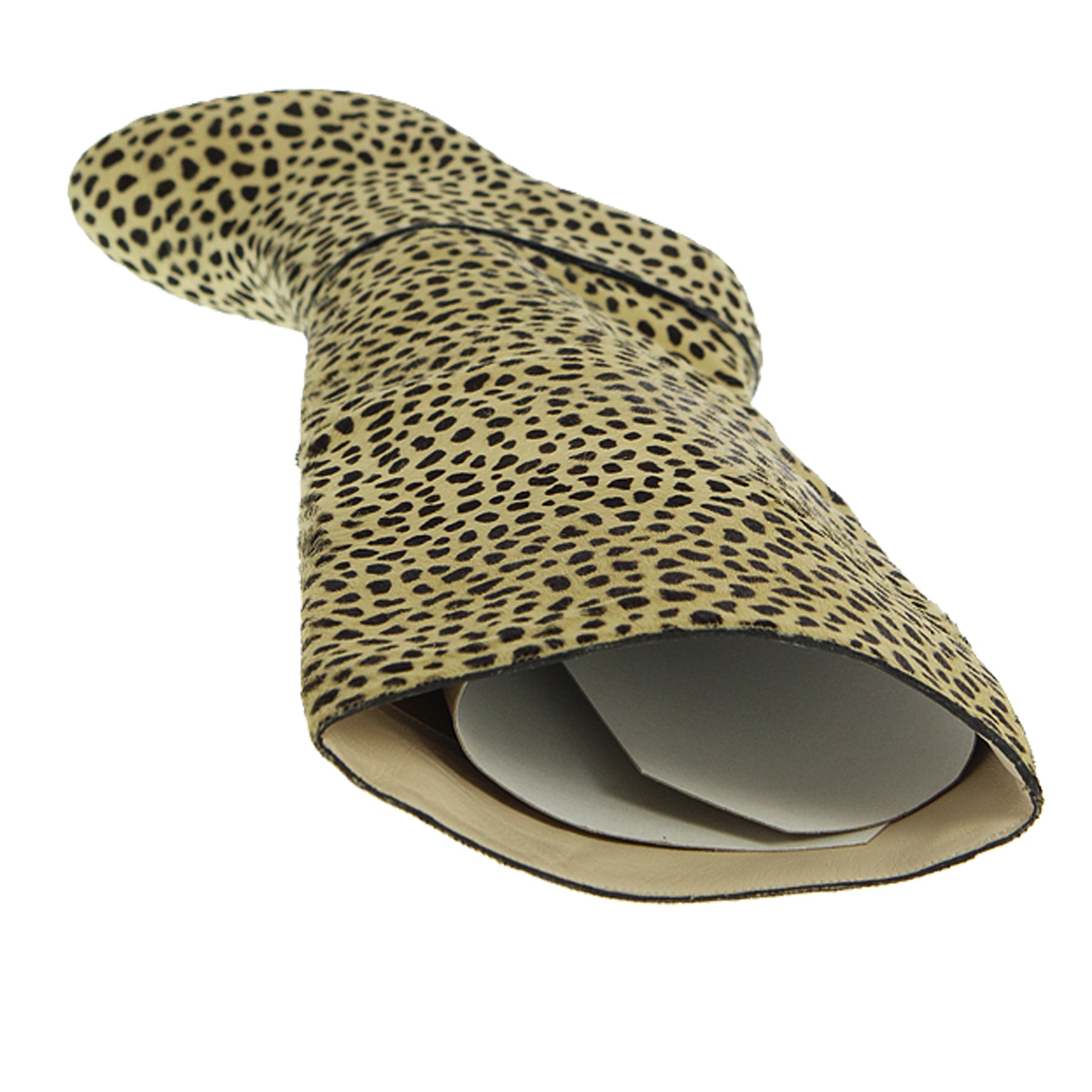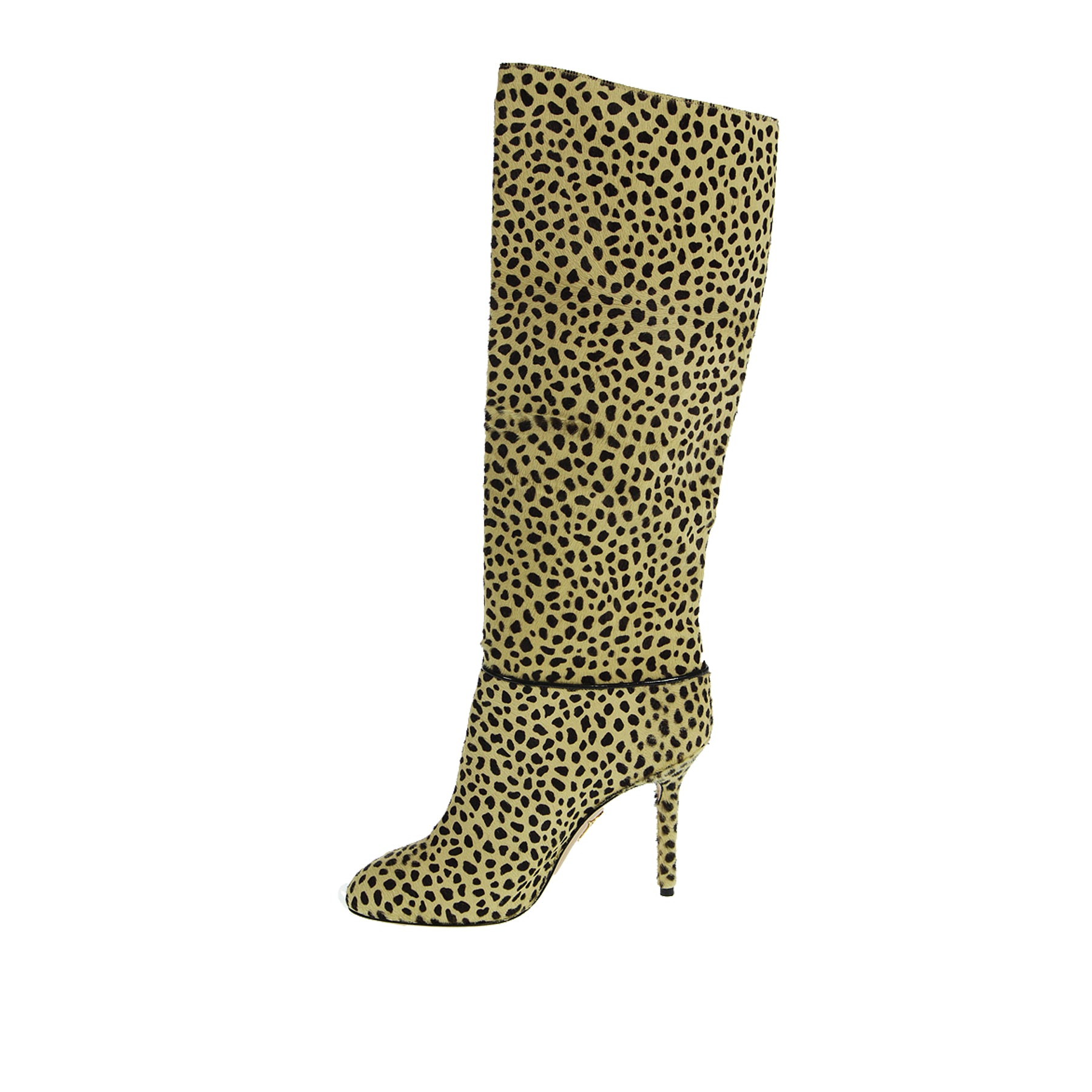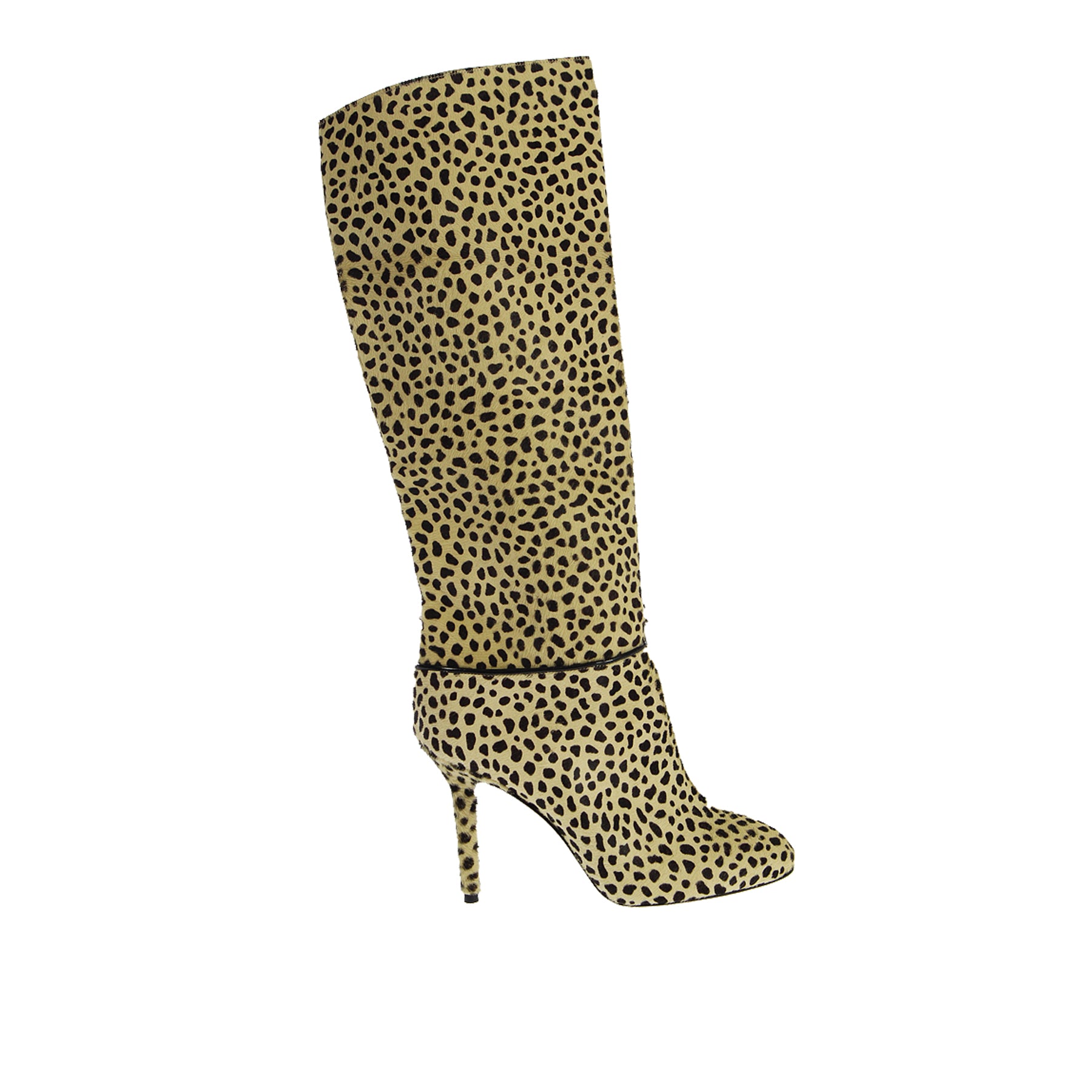 Stivale Charlotte Olympia, in cavallino, maculato, con gambale alto, tacco a spillo, suola in cuoio, altezza tacco 10 cm