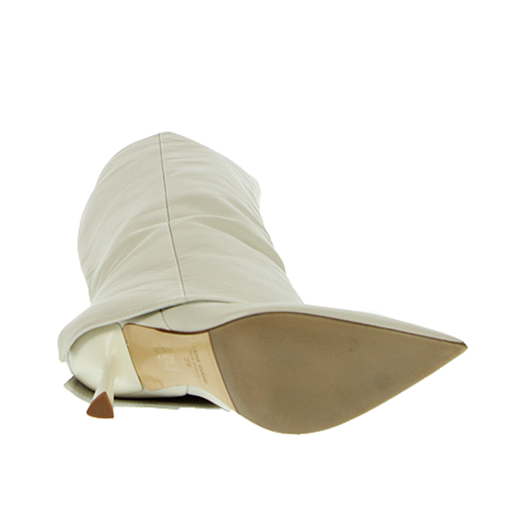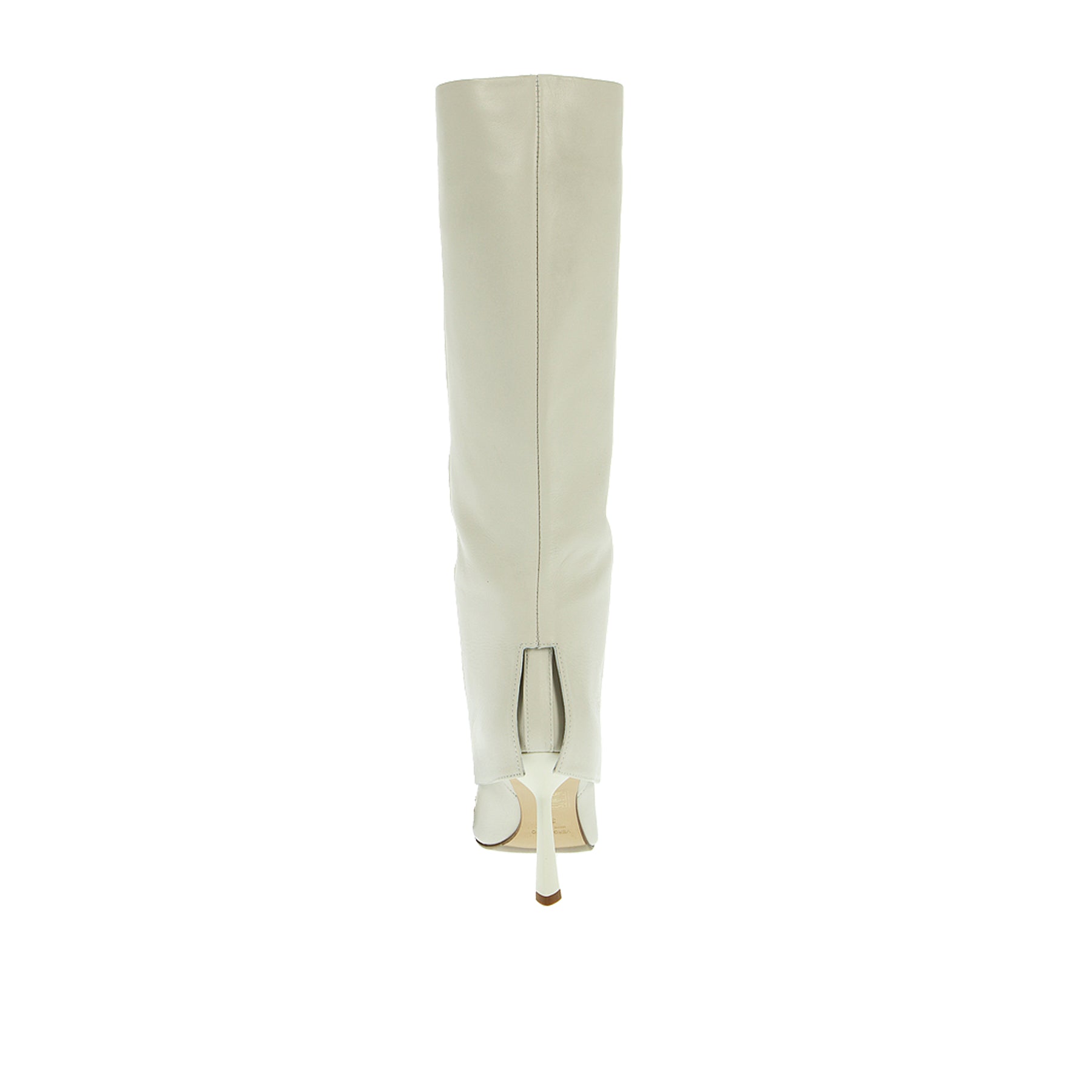 Stivale Chantal, in pelle bianco sporco, con gambale alto, a punta, tacco 10 cm, suola in cuoio e gomma