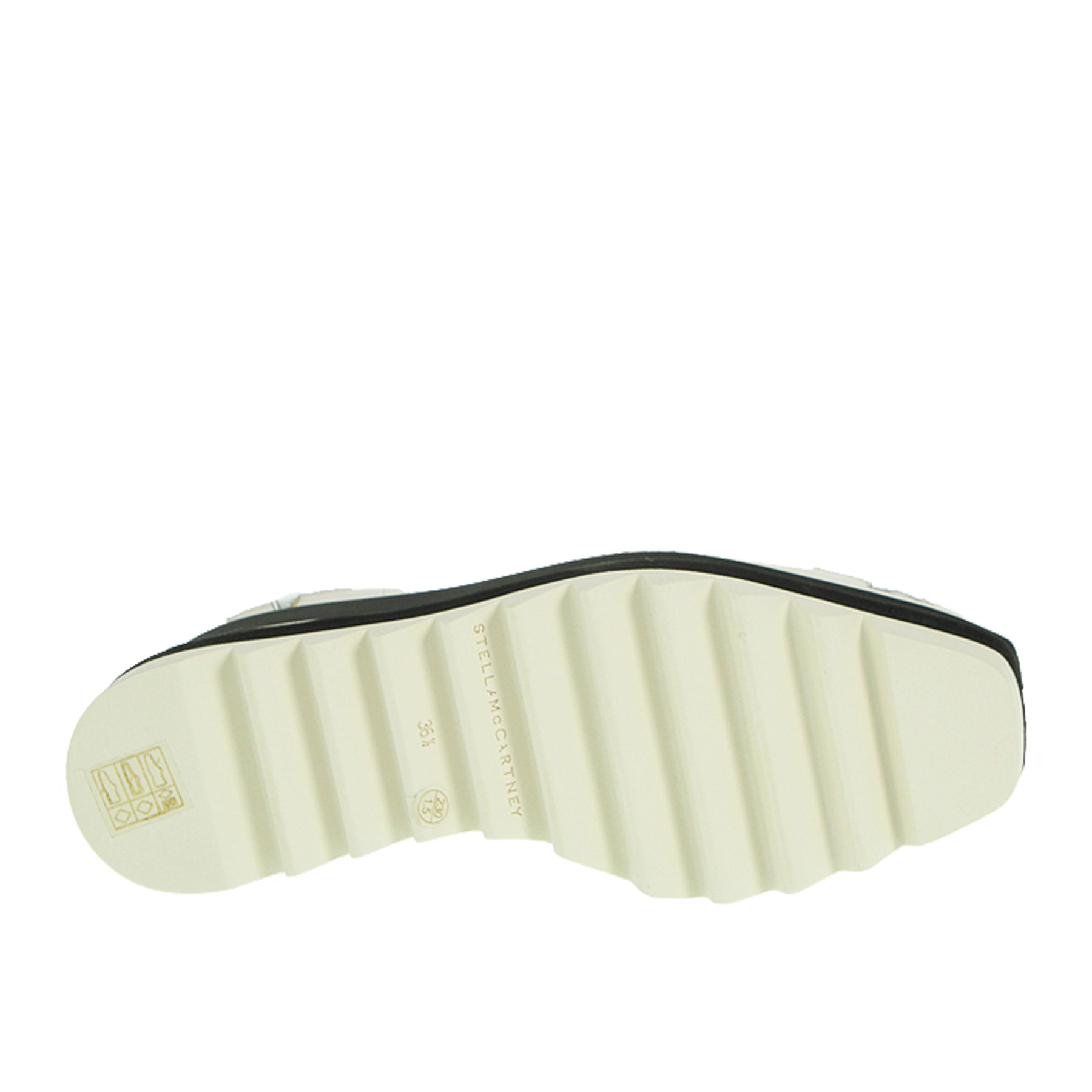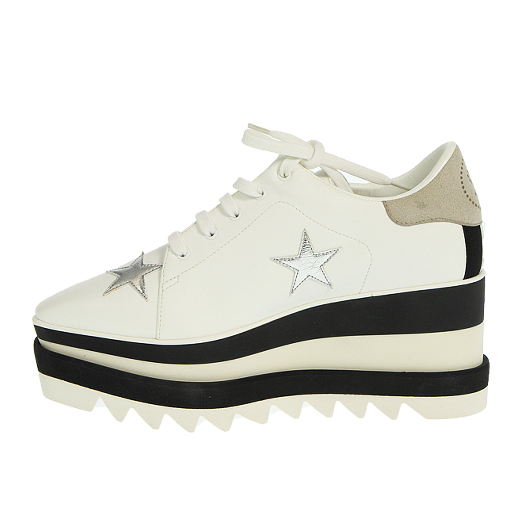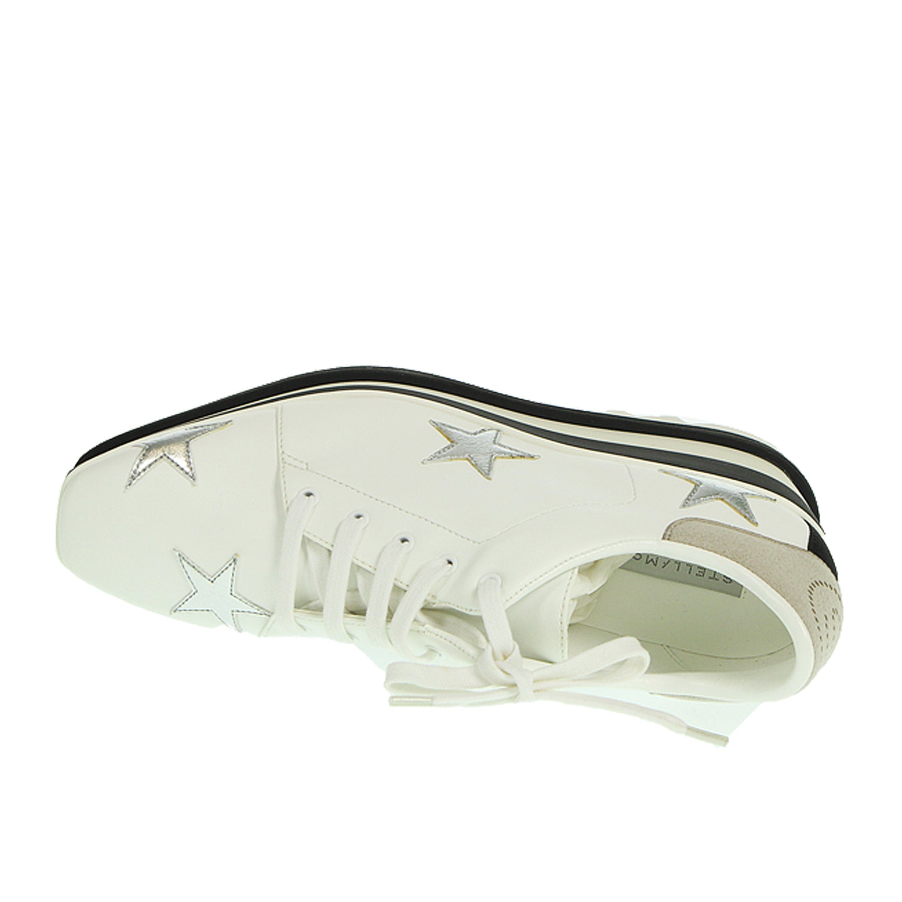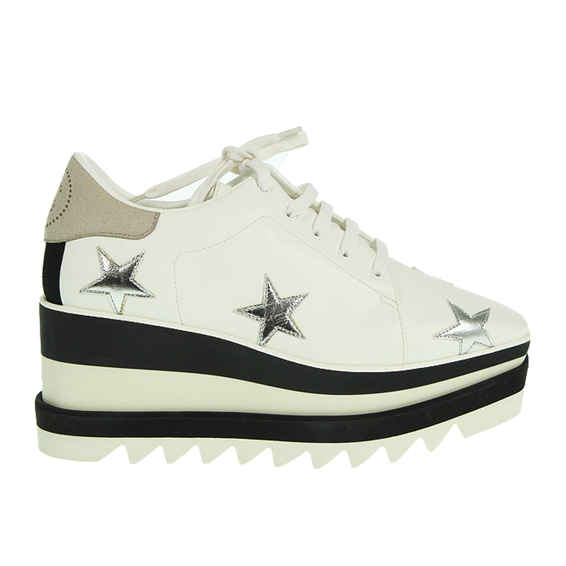 Stringata con zeppa Stella McCartney, modello Elyse, in ecopelle, colore biabco, con stelle argentate, con micro imperfezioni. Altezza zeppa 8 cm, suola in gomma.